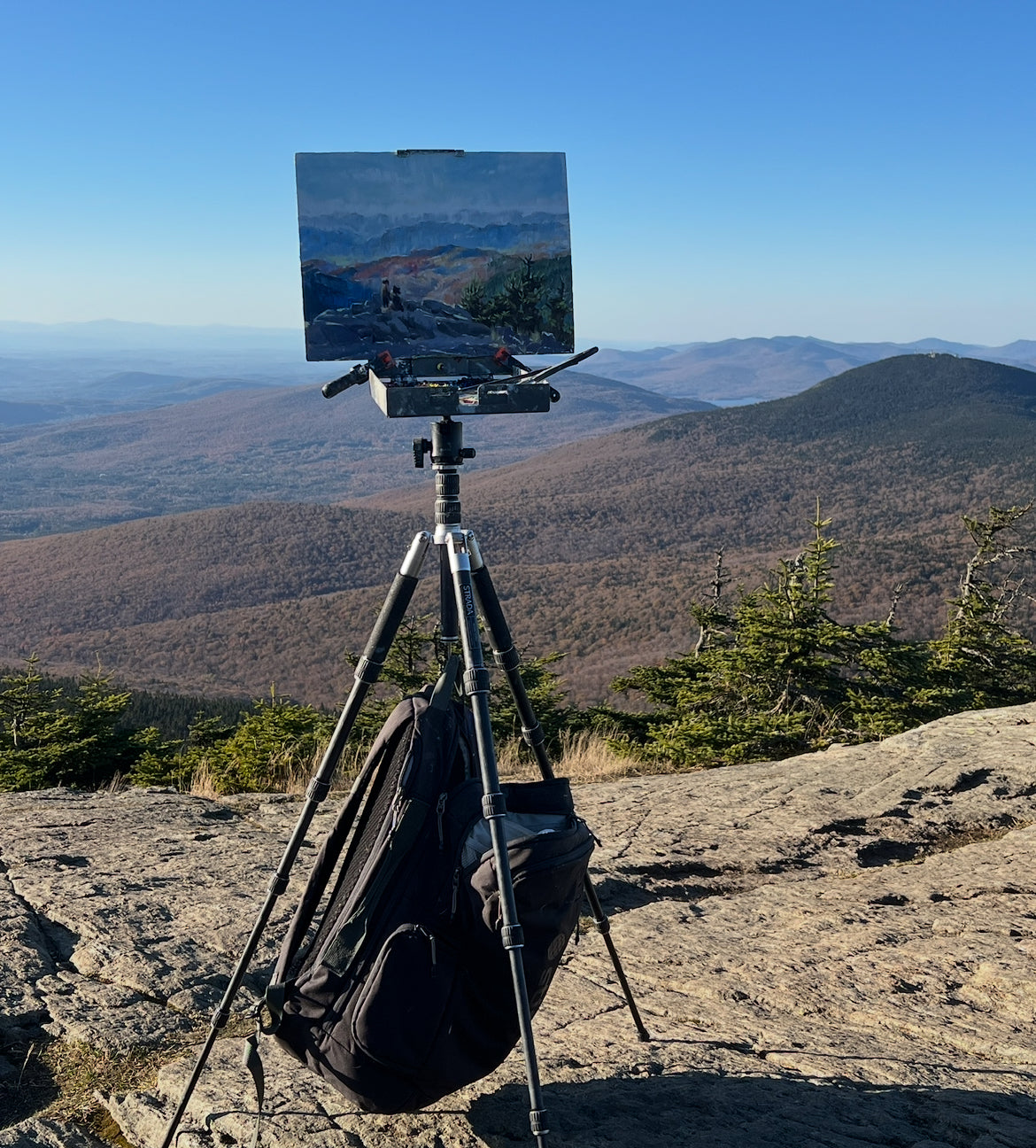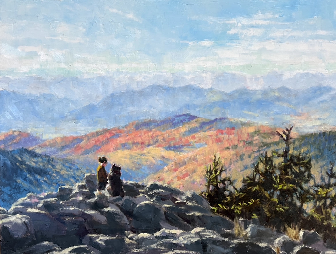 “Let's Sit Here a While” is an original "plein air" oil painting of a woman and her dog from the summit of Killington peak in Vermont.