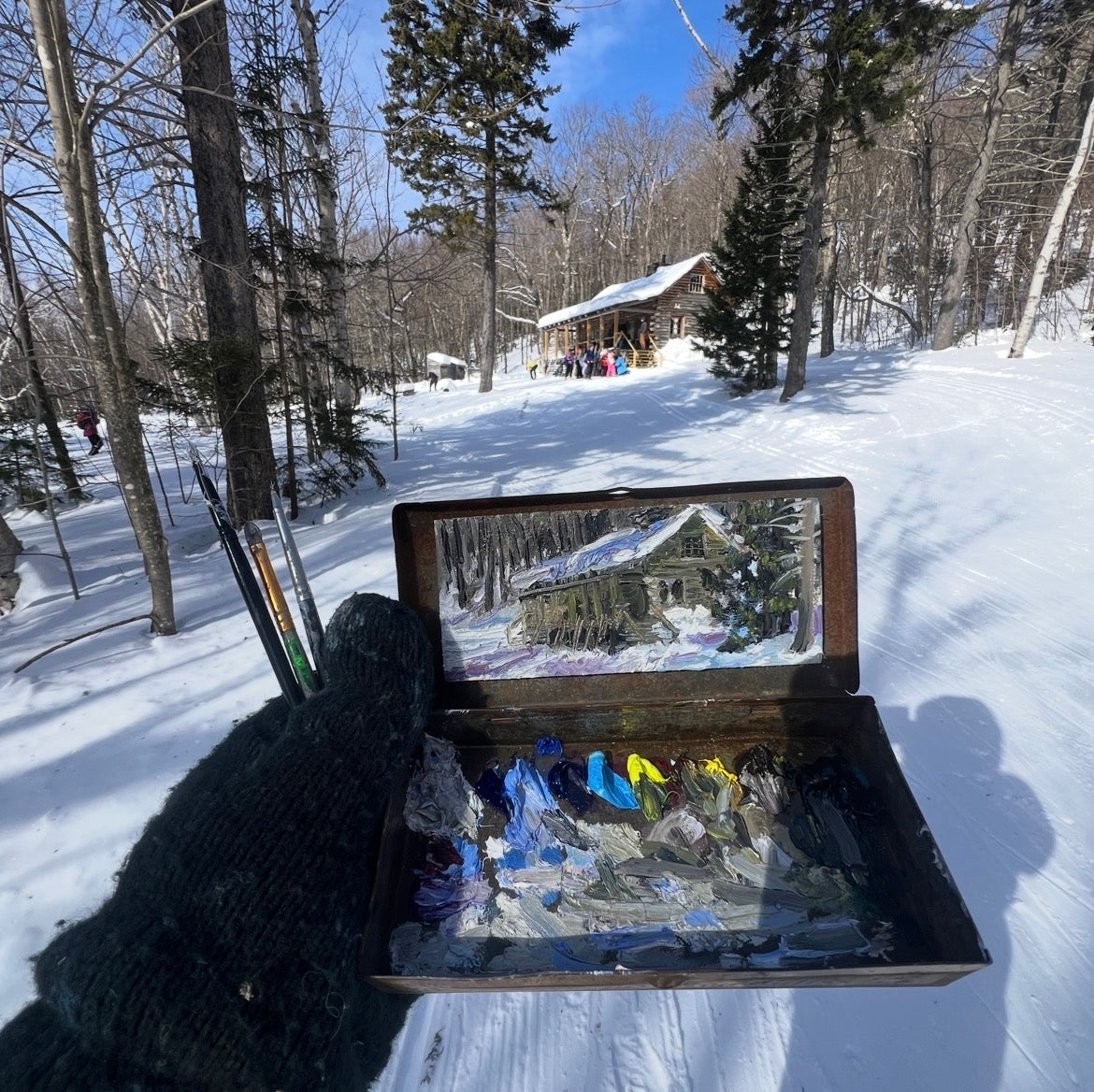 “Trailside Cabin” is an original oil painting. This piece was painted in Stowe, VT from the Trapp XC ski trails looking towards the Adam’s Cabin.